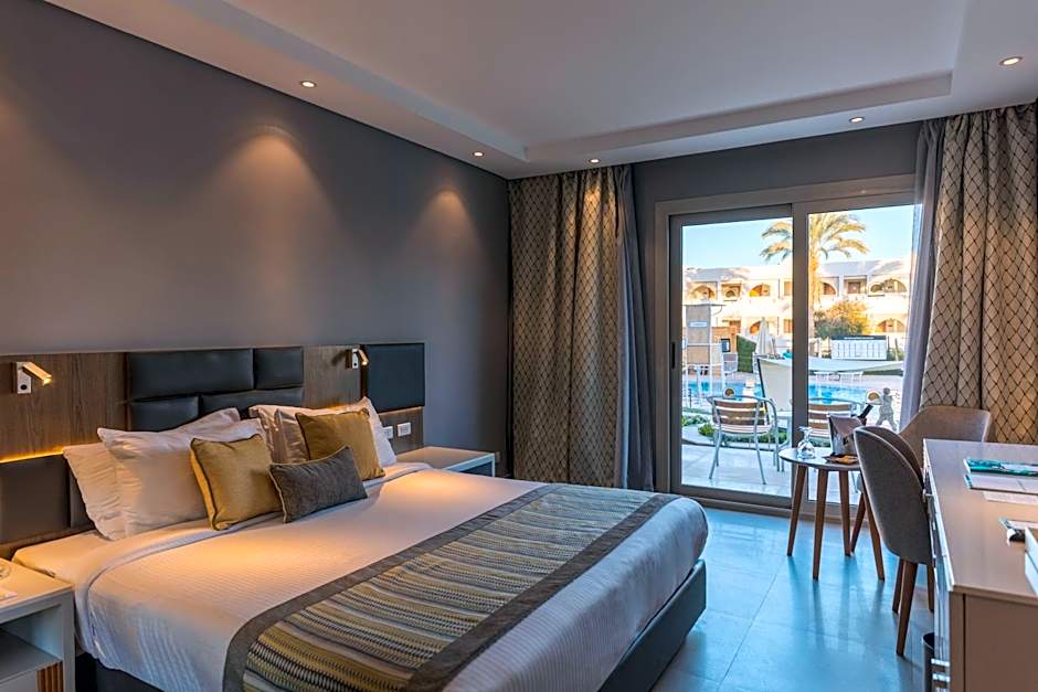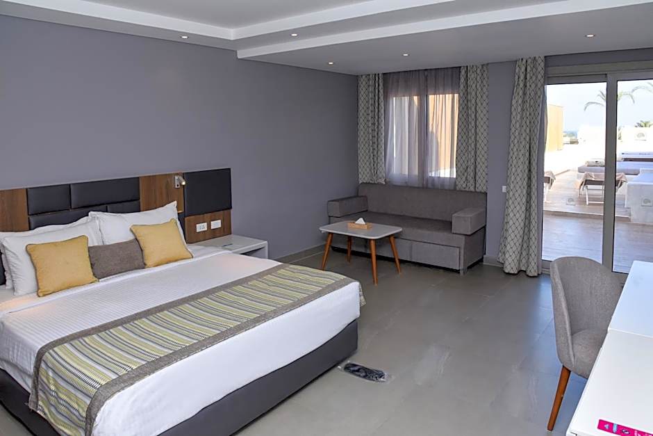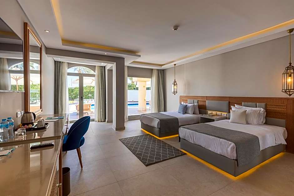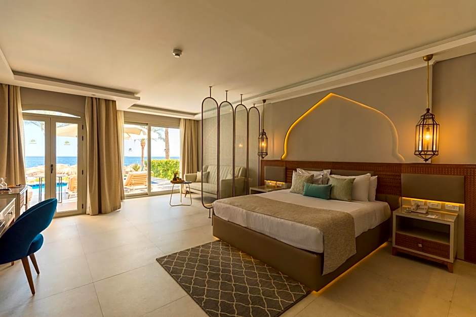 Bedroom with King Size Bed or Twin Beds, Seating Area, Bathroom with Shower, Terrace with access to shared Swim-Up Pool, for adults only, minimum 16 + years old.