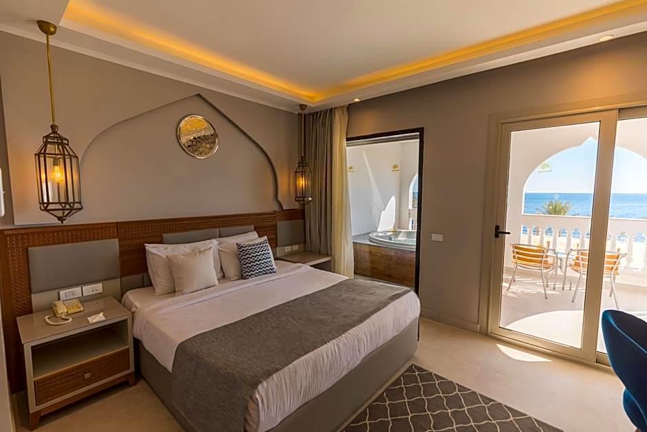 The room features a king size bed or twin beds, a seating area, a bathroom with a shower and a separate bathtub, a terrace and a direct view of the sea.